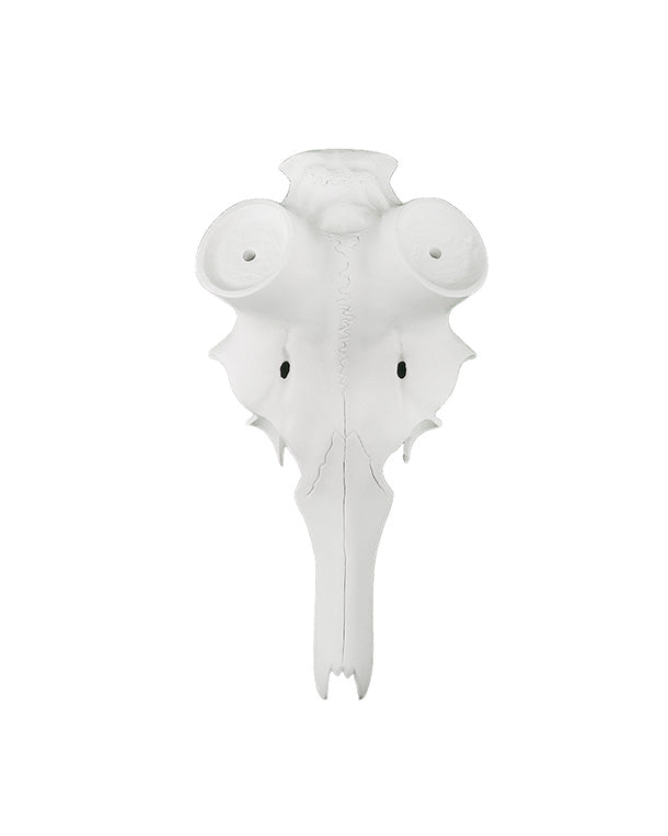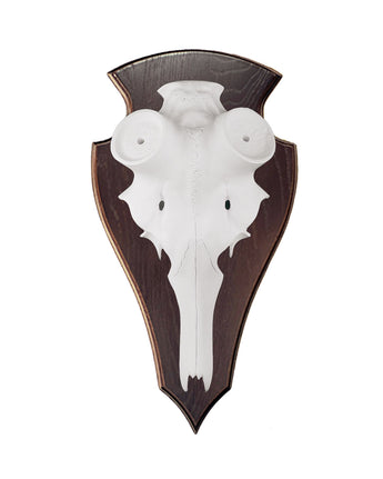 Auf der Rückseite der Aluminiumschädel befindet sich eine eingegossene Mutterschraube für die Befestigung auf dem Geweihschild und ein eingegossener Dorn, welcher ein Verrutschen auf dem Schild verhindert. Diese Aluschädel sind knochenfarbig koloriert. Diese Schädel sind auch gut für die Montage im Freien geeignet. Schrauben für die Montage des Gehörns sind im Lieferumfang enthalten.