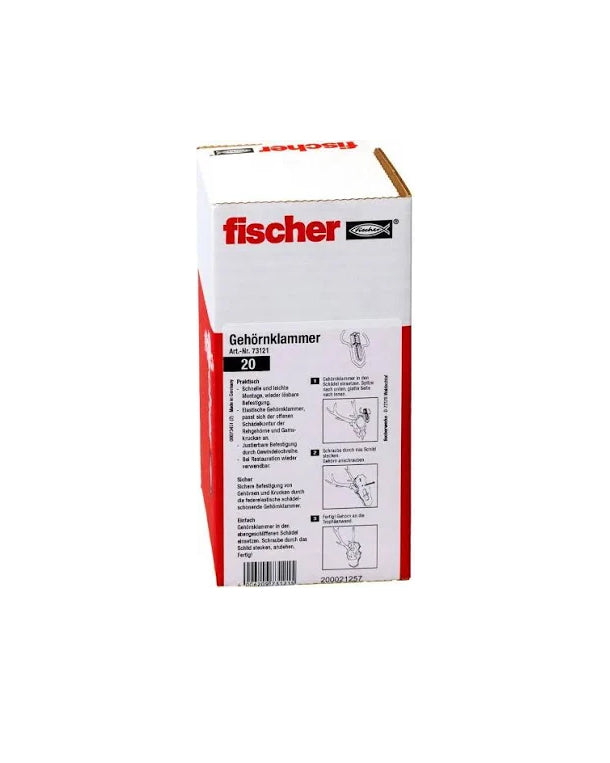 Die Gehörnklammer von Fischer präsentiert sich als unkomplizierte, praktische und sichere Lösung für die Befestigung Ihrer Rehbock- oder Gamstrophäen auf einem Gehörnbrett. Dank ihrer elastischen Flügel passt sich die Gehörnklammer mühelos an jede Schädelgröße an. Die praktische 11er-Lochreihe ermöglicht eine einfache Verbindung der Klammer mit jedem Trophäenschild.