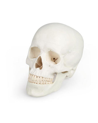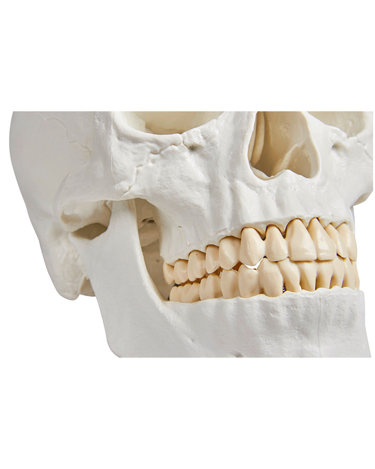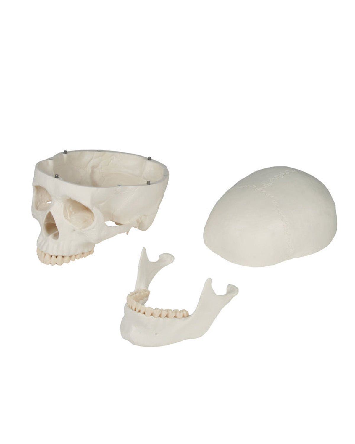 Nello sviluppo di questa riproduzione realistica di un cranio umano, un vero cranio umano è stato digitalizzato utilizzando tecnologie all'avanguardia e poi idealizzato secondo gli standard di formazione medica. Ciò significa che il cranio è stato perfettamente adattato all'ideale anatomico; tutti i dettagli e le strutture anatomiche sono presenti e corrispondono agli esempi dei libri di testo. Il modello in tre parti è costituito da base cranica, calotta cranica e mandibola. I denti corrispondono a una dentatura reale in termini di posizione e spaziatura. La mandibola è montata in modo mobile e rimovibile. La calotta cranica è allineata alla base cranica tramite perni metallici infrangibili e mantenuta in posizione da potenti magneti, eliminando la necessità di fastidiosi ganci, prevenendo la rottura dei perni e garantendo che non vi siano spazi vuoti tra base cranica e calotta cranica. Questo distingue significativamente il modello dai modelli concorrenti con perni di plastica o fastidiosi ganci metallici. Il cranio corrisponde per dimensioni e proporzioni a un adulto europeo medio. Grazie alla tecnologia di produzione all'avanguardia e all'elevato volume di produzione, possiamo offrire questo modello di grande successo a un prezzo molto conveniente, rendendo questo modello di cranio di alta qualità accessibile a tutti.