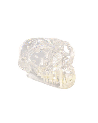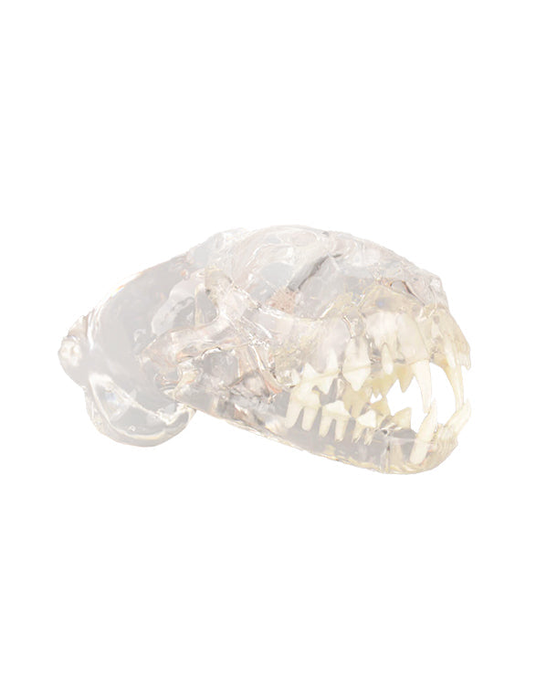 Questa replica del cranio di un gatto offre un'affascinante panoramica della struttura anatomicamente corretta della dentatura di un gatto sano. La struttura trasparente consente una visione dettagliata della disposizione dei denti, delle articolazioni mascellari e della struttura ossea. La mascella è mobile e può essere aperta e chiusa, il che la rende ideale per dimostrare la funzione del morso.