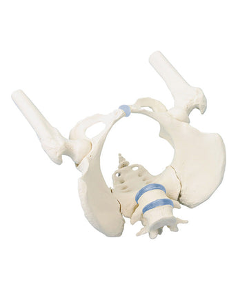 Calco naturale del bacino di una donna adulta. L'osso sacro è rimovibile, consentendo la dimostrazione dei movimenti dell'articolazione sacroiliaca. Le vertebre sono dotate di articolazioni mobili e i monconi femorali sono mobili e rimovibili.