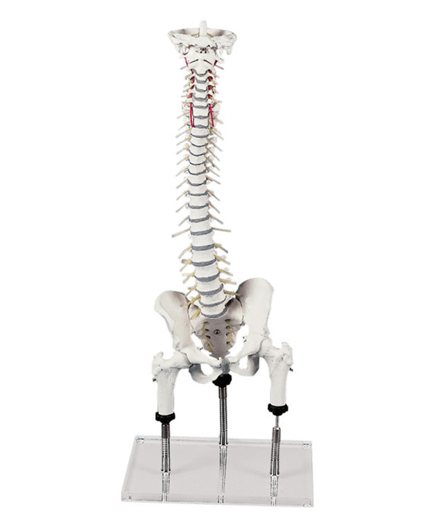 Colonna vertebrale per dimostrare disallineamenti di bacino e femore. Questo modello consente la simulazione dei movimenti delle cosce a livello dell'articolazione dell'anca. Le cosce possono essere sollevate e abbassate singolarmente, simulando dislivelli unilaterali delle gambe e la conseguente obliquità pelvica. Il modello dimostra come questi squilibri vengano compensati a livello di bacino e colonna vertebrale. È particolarmente adatto per l'uso in fisioterapia e massoterapia, nonché in ortopedia come modello dimostrativo. La colonna vertebrale completa è facilmente staccabile dal supporto.