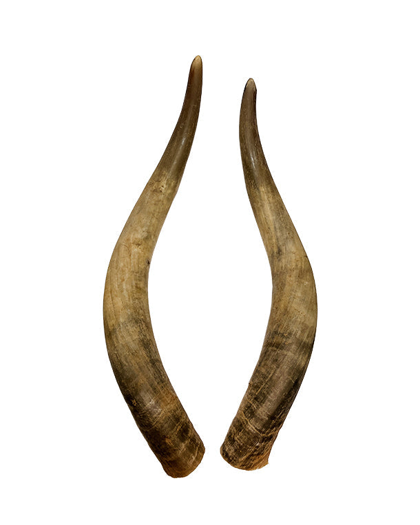 Die Hörner sind hohl, der Hornzapfen wurde entfernt. Sie wurden sorgfältig gereinigt und befinden sich im rohen, unbehandelten Zustand perfekt zur individuellen Weiterverarbeitung.