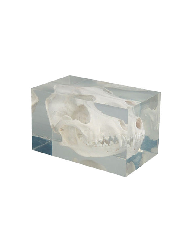 Echter Hundeschädel eingebettet in unzerbrechlichem Kunststoff. Durch das Eingießen ist der Schädel absolut hygienisch und bruchsicher. Ideal als Anschauungsobjekt.
