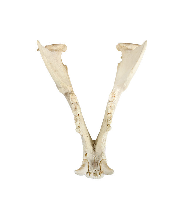 Der linke Zahn weist einen Knickriss auf und ist leicht beschädigt.