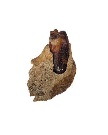 Dieser Backenzahn stammt von einem Höhlenbären (Ursus spelaeus), der vor etwa 500.000 Jahren aus dem Denninger Bären hervorging. Der Zahn, gefunden in der Steiermark, Österreich, datiert ins Pleistozän und ist ein Zeugnis dieser beeindruckenden Spezies, die ausschließlich in Europa lebte.