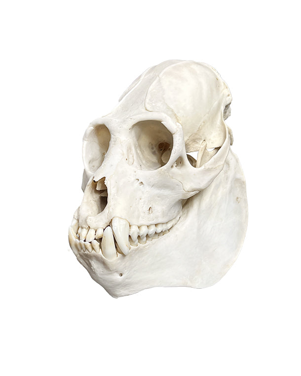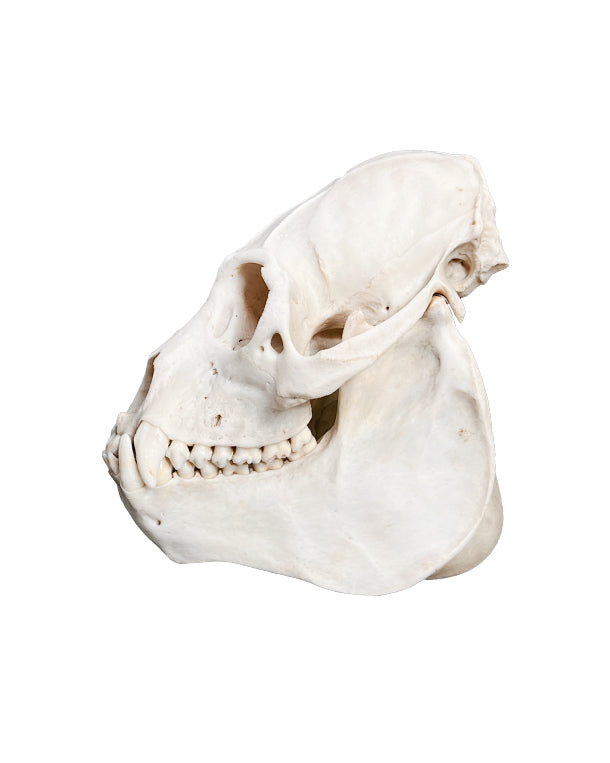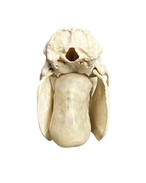 Der Schwarze Howler-Affe (Alouatta caraya) ist in den Regenwäldern Südamerikas beheimatet und bekannt für seinen markanten, tiefen Ruf, der bis zu 3 Kilometer weit zu hören ist. Dieser Affe lebt in großen Gruppen und ernährt sich hauptsächlich von Blättern, Früchten und Blumen. Besonders faszinierend ist der Zungenbeinknochen (Hyoid) des Schwarzen Howler-Affen. Dieser Knochen ist bei ihm außergewöhnlich groß und stark ausgeprägt. Durch diese spezielle Entwicklung kann der Affe seinen markanten Ruf erzeugen. Der Zungenbeinknochen ist dabei so angepasst, dass er als Resonanzkörper fungiert, was den kräftigen und durchdringenden Laut verstärkt. Diese Anpassung ist besonders bei den männlichen Affen ausgeprägt, die oft lautstark ihr Territorium verteidigen.