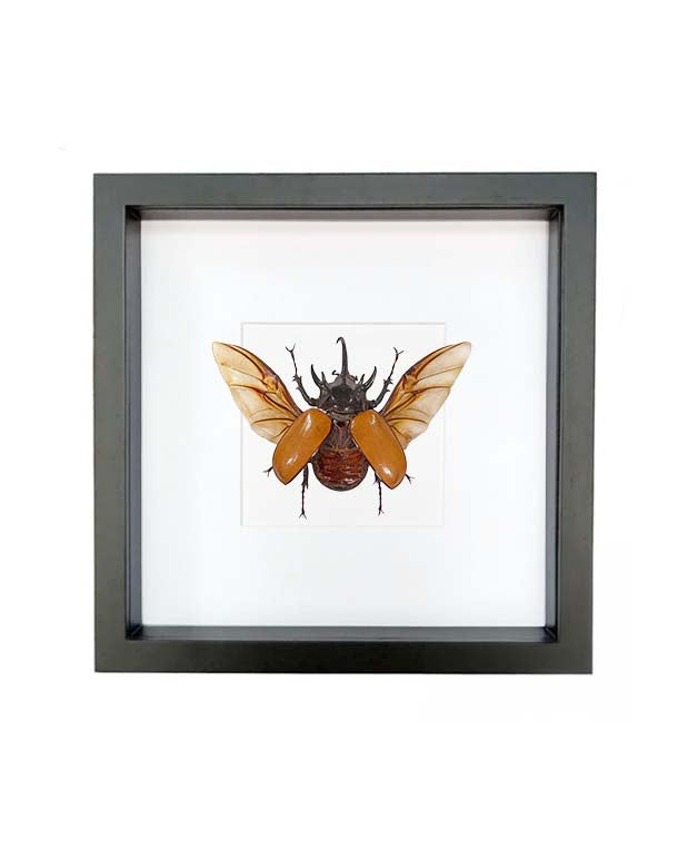 Der Käfer (ca. 10 x 17 cm) wird in einem Bilderrahmen montiert, um ihn dekorativ und optimal zur Geltung zu bringen. Der helle Hintergrund betont den dunklen Käfer zusätzlich. Der Bilderrahmen hat eine Größe von 25 x 25 cm.