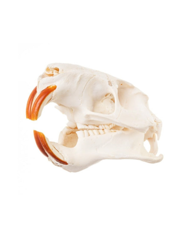 Der Schädel der Nutria ähnelt dem des Bibers, ist aber insgesamt kleiner und etwas breiter geformt. Während der Biber einen länglicheren Schädel hat, wirkt der Nutria-Schädel kompakter. Beide Tiere besitzen auffällige orangefarbene Schneidezähne, die sie zum Nagen nutzen. Beim Biber sind diese Zähne größer und kräftiger, da er härtere Materialien wie Holz bearbeitet, während die Nutria weiche Wasserpflanzen bevorzugt. Die Unterschiede in der Schädelform spiegeln die unterschiedlichen Lebensweisen der beiden Nagetiere wider.