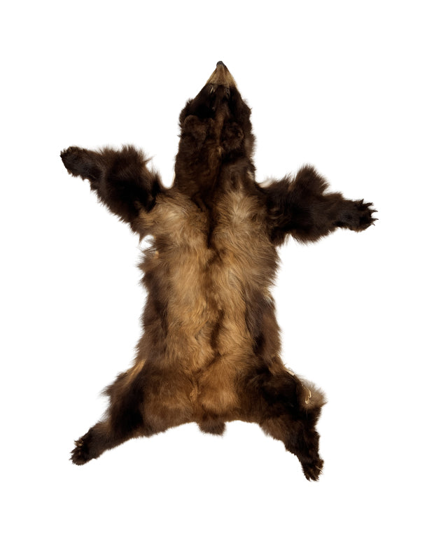 Dieses Schwarzbärenfell von einem nordamerikanischen Schwarzbären in der seltenen Cinnamon-Farbvariante, bei der das Fell eine auffällige rotbraune bis zimtartige Tönung aufweist. Obwohl sie farblich an einen Grizzly erinnert, handelt es sich um eine natürliche Variante des Ursus americanus, nicht zu verwechseln mit dem Braunbären.