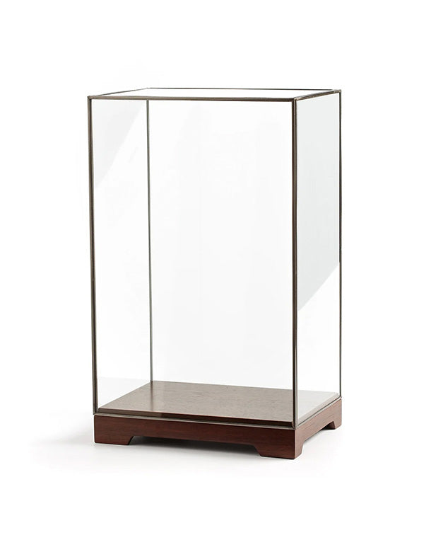 Die Vitrine überzeugt mit ihrer geräumigen, vollverglasten Konstruktion, die Tierschädel optimal in Szene setzt und gleichzeitig zuverlässig vor Staub schützt. Der Rahmen aus hochwertigem messingfarbenem Metall sorgt für Stabilität und verleiht der Vitrine eine luxuriöse Note. Der Sockel besteht aus robustem MDF und ist mit einem eleganten Nussbaumfurnier veredelt, das Wärme und Klasse ausstrahlt.