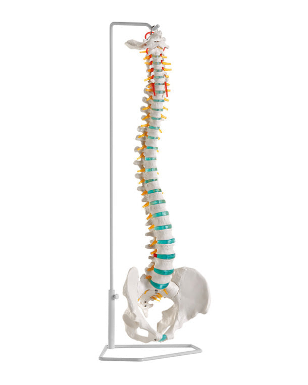 Flexible lebensgrosse Wirbelsäule. Sie besteht aus Os occipitale, Hals-, Brust- und Lendenwirbeln, Os sacrum, Os coccygis und dem vollständigen Becken. Ebenfalls dargestellt sind die Vertebralarterien, die Äste der Spinalnerven und eine Bandscheibe mit Prolaps in Höhe von L3–L4. Mit Stativ zum Aufhängen.