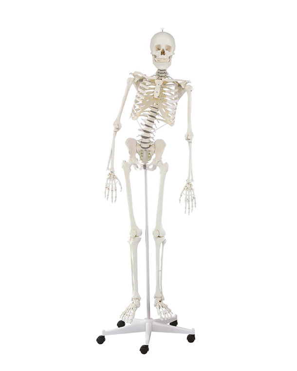 Alle Erler-Zimmer-Skelette sind Abgüsse von natürlichen Skeletten in höchster Qualität und Detailtreue. Die Modelle aus widerstandsfähigem Kunststoff zeigen alle anatomischen Details, Strukturen, Fissuren, Foramina und Processus. Alle Knochen sind einzeln gefertigt und sorgfältig zusammengebaut. Hände und Füße sind flexibel auf Draht montiert. Arme, Beine und der Schädel können leicht abgenommen und zum Teil zerlegt werden. Das 5-strahlige Rollenstativ gibt dem Modell immer sicheren Stand und ermöglicht den einfachen Transport von Raum zu Raum.