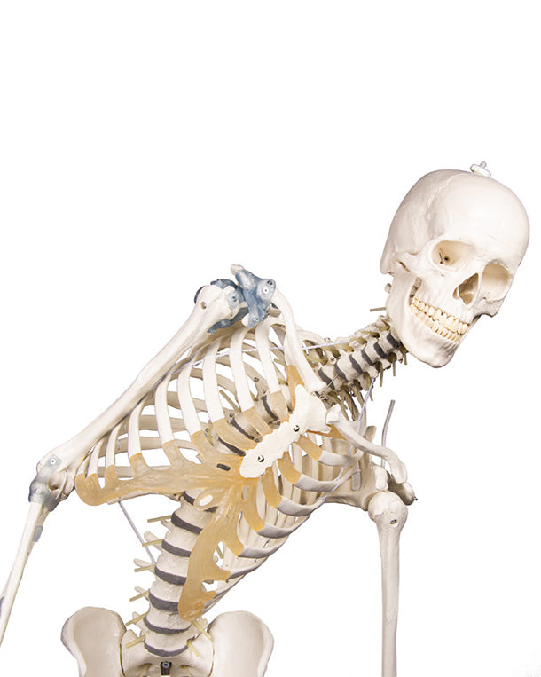 Das Therapieskelett hat eine bewegliche Wirbelsäule und Gelenkbänder.