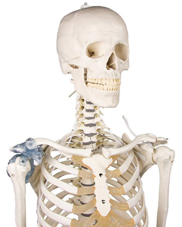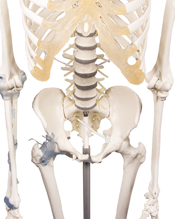 Schulter und Hüfte sind ohne störende Metallteile montiert und bieten die Möglichkeit, neben Rotationsbewegungen auch Gleitbewegungen im Gelenk zu demonstrieren. Die Gelenkflächen gleiten direkt aufeinander und machen es erstmals möglich, alle Gleit- und Traktionsmöglichkeiten entsprechend manueller Prinzipien und der Biomechanik zu demonstrieren.