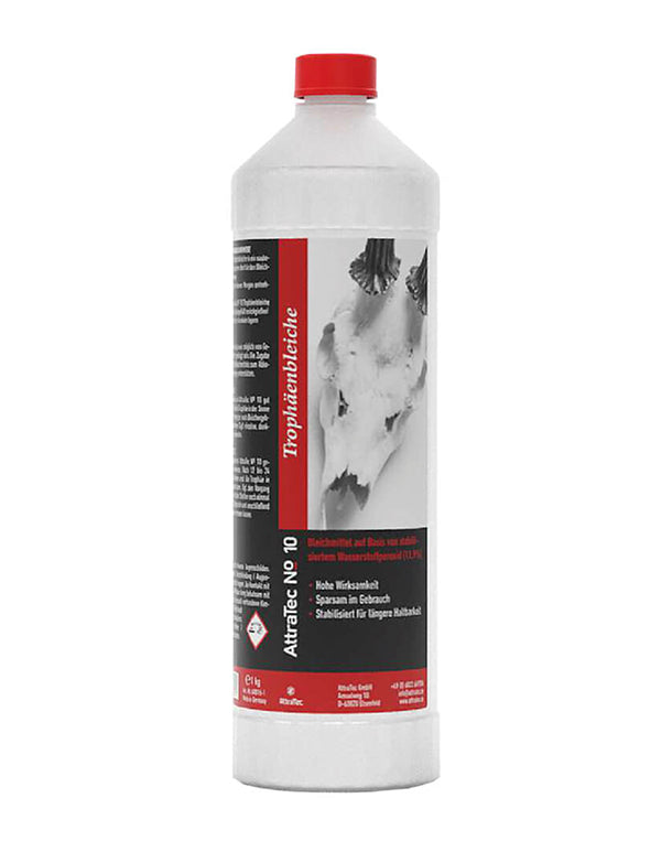 Entweder den abgekochten Schädel mit Attratec N°10 Trophäenbleiche einpinseln, anschließend in der Sonne trocknen lassen und diesen Vorgang je nach Ergebnis ein- bis zweimal wiederholen – oder den abgekochten Schädel mit Attratec N°10 Trophäenbleiche getränkter Watte umwickeln, nach 12–24 Stunden die Watte entfernen und die Trophäe in der Sonne trocknen lassen. Ggf. muss auch dieser Vorgang wiederholt oder einzelne Stellen bepinselt werden. Die Flasche beinhaltet 1 kg Attratec N°10 Trophäenbleiche.